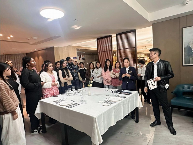 为深入贯彻落实党的二十大精神和习近平总书记考察江西重要讲话精神,创新党组织活动方式,不断提高党的建设质量,把党建优势转化为课程优势、专业优势、业务优势,XC体育教工第二党支部有效发挥党建引领“主引擎”作用,进一步加强支部建设、团队建设与人才培养的深度融合,将课程思政、课程实践与专业教学紧密结合,于2024年10月30日组织了一场别开生面的《酒店英语》课程实践活动。由教工第二党支部成员、酒店管理教研室主任郭清带队,党支部成员、《酒店英语》课程思政团队负责人贾超老师、课程组成员张静老师和酒店管理专业A2351、2352班全体员工,以及来自巴基斯坦、加纳、坦桑尼亚、厄立特里亚等国家的十余名外国职工,共同前往庐山开元名庭度假酒店开展《酒店英语》课程实践学习。
